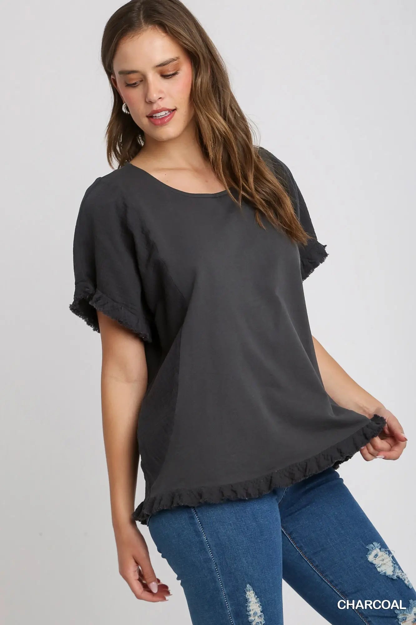Fray Trim Ruffle Top - Charcoal