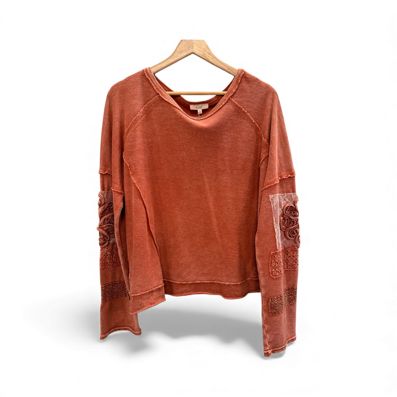 Meet your new boho favorite — the Inside Out Washed Terry Pullover in Brick. Designed with exposed seams, lace insets, textured crochet panels, and 3D rosette appliqués on the sleeves, this top brings all the boutique charm.