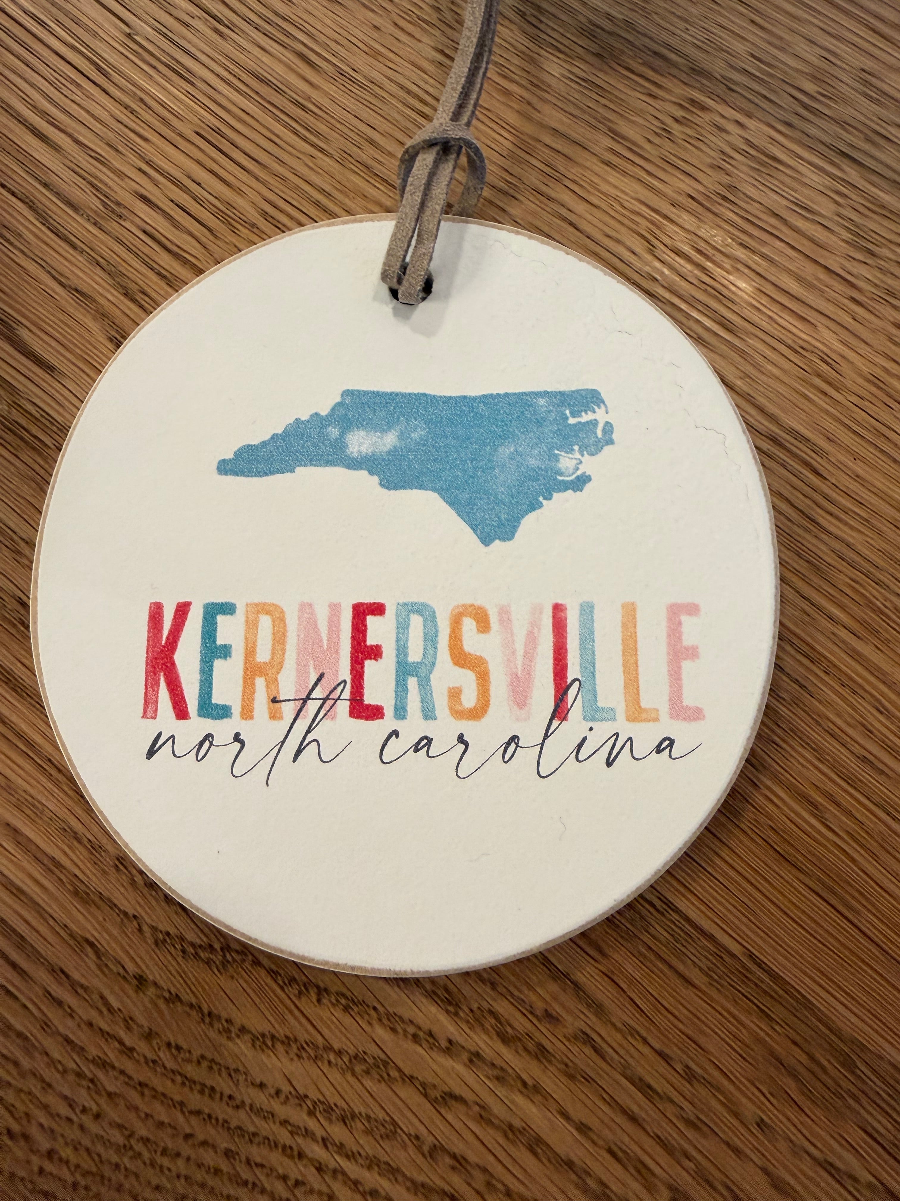 Celebrate hometown charm with this round Kernersville, North Carolina Christmas ornament. Featuring a watercolor-style NC state silhouette and colorful Kernersville lettering, it's the perfect keepsake for locals, new residents, or anyone who loves our small town.
