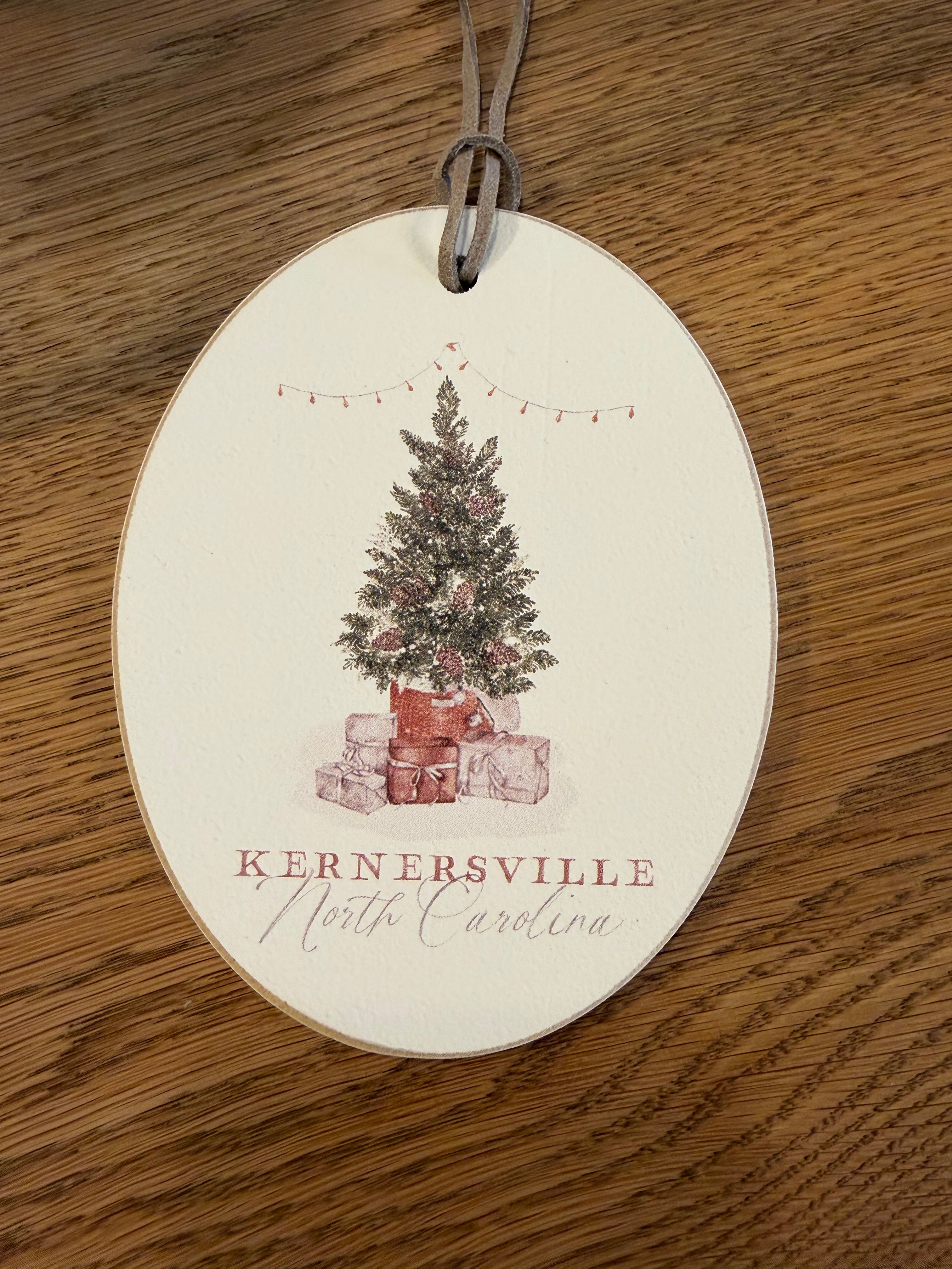 Bring a touch of hometown charm to your tree with this Kernersville, North Carolina oval Christmas ornament. Featuring a festive holiday tree with wrapped gifts and soft vintage coloring, this locally inspired keepsake is perfect for gifting or collecting.