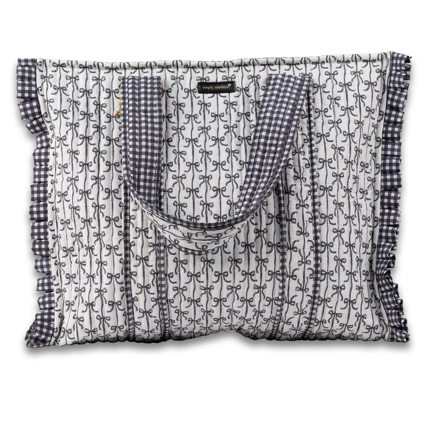 The Quilted Tote is perfect for the everyday. It features a structured construction, two top handles for easy carrying, exterior zippered pocket for easy access, zippered main compartment, and the Simply Southern gold tone logo label. Made of 100% polyester. L: 16" x W 5" x H: 18"