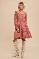 This Tiered Square Neck Mini Dress is the perfect mix of feminine and effortless. Designed with a flattering square neckline, soft puff sleeves, and a flowy tiered skirt, this dress is easy to dress up or down for any occasion. The mauvehue adds a soft, romantic touch that works year-round.