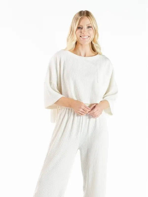 The Simply Southern Corded Pant in Pearl features a soft textured corded fabric, relaxed wide-leg fit, and comfortable elastic waistband for an easy, flattering silhouette.