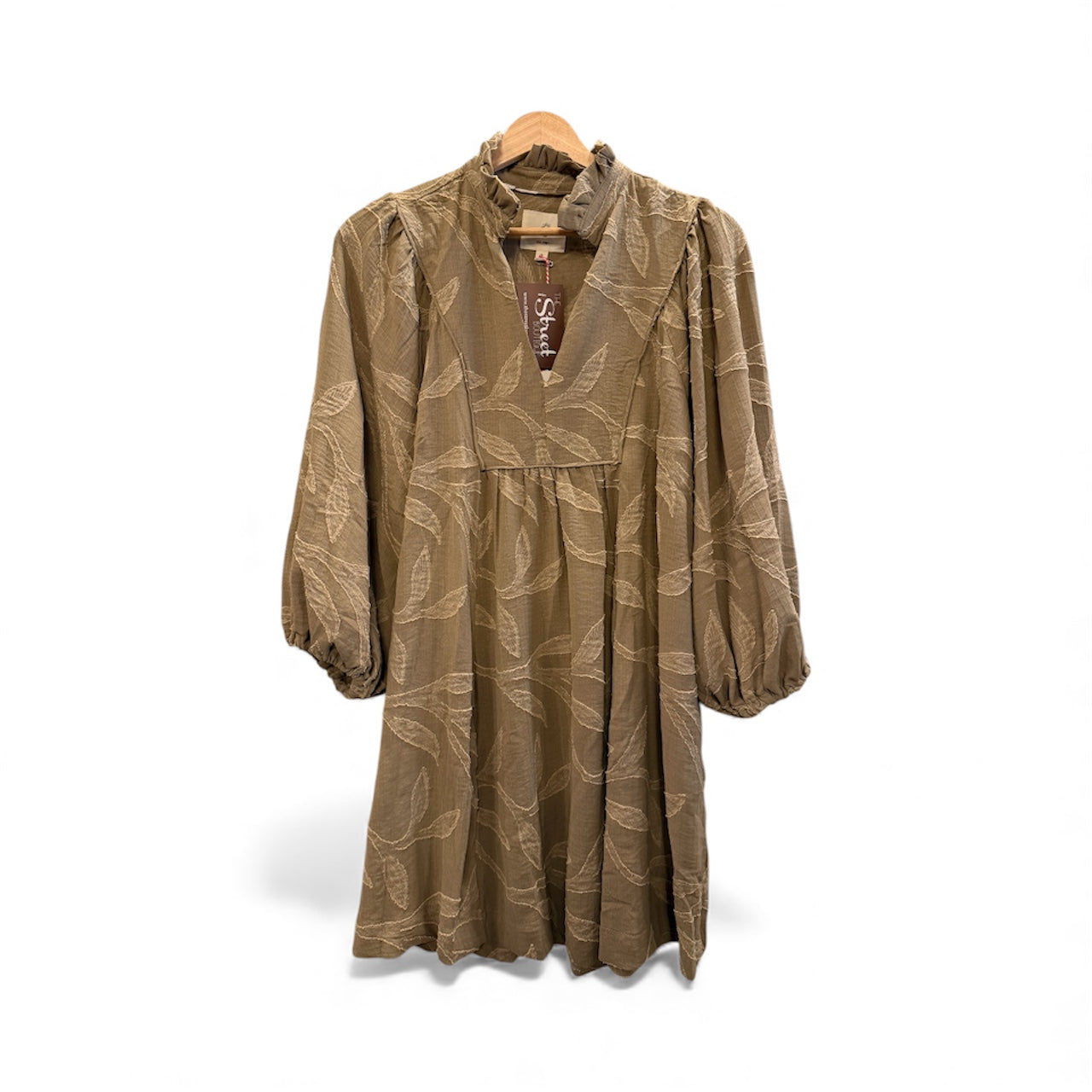 Romantic and timeless, this jacquard mini dress is the perfect blend of comfort and elegance. Featuring a textured leaf pattern and a flattering babydoll silhouette, it’s detailed with a ruffled neckline and billowy sleeves for an effortlessly feminine touch. The mushroom hue makes it a versatile piece for any season — pair with boots, heels, or flats for a chic boutique look.