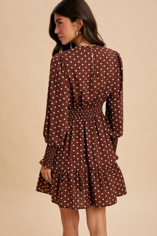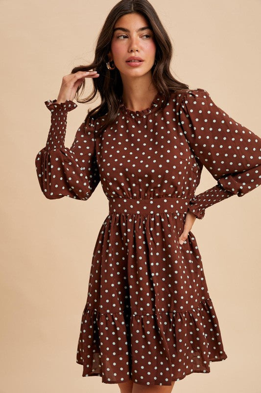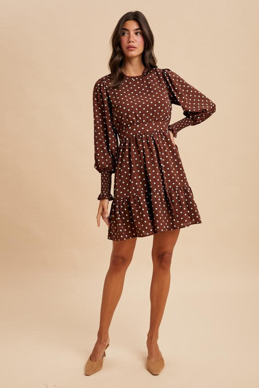 Playful meets polished 🎀 This brown polka dot mini dress has all the charm — smocked sleeve cuffs, a defined waist, and just the right amount of twirl. So cute for fall layering or dressing up solo.