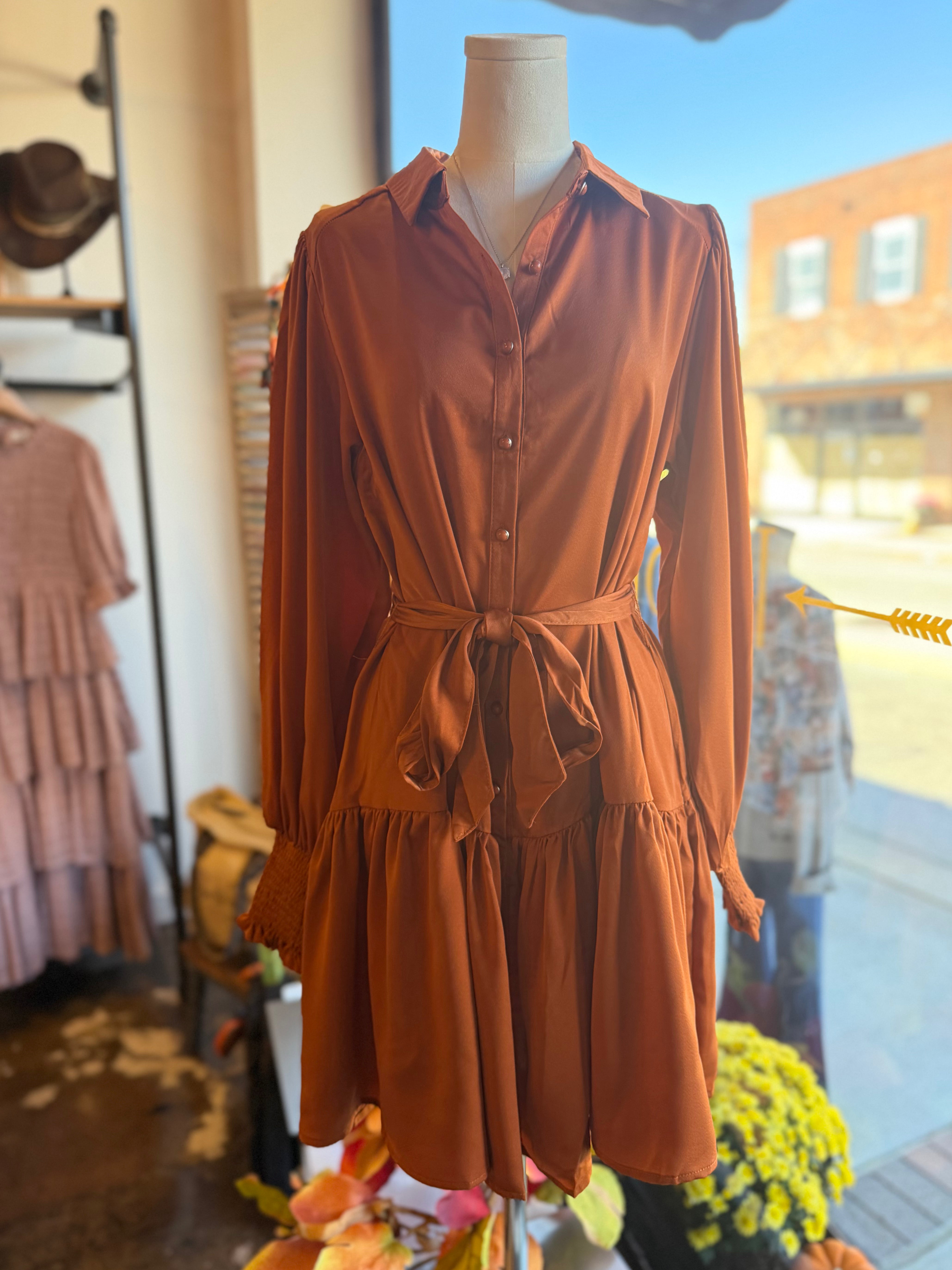 Turn heads in the Cinnamon Satin Dress, a timeless piece that blends classic tailoring with a modern, feminine edge. The silky satin fabric drapes beautifully, while the tie waist and smocked cuffs add flattering detail. Perfect for fall events, date nights, or weekend brunch with the girls.