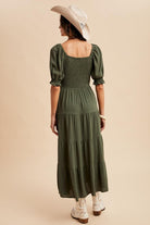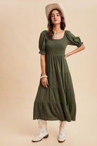 The Forest Green Smocked Tiered Maxi Dress is a chic and versatile piece that blends comfort with timeless style. With its flattering smocked bodice, puff sleeves, and flowy tiered skirt, this maxi dress moves gracefully for any occasion. The deep forest green shade makes it a perfect transitional piece for every season.