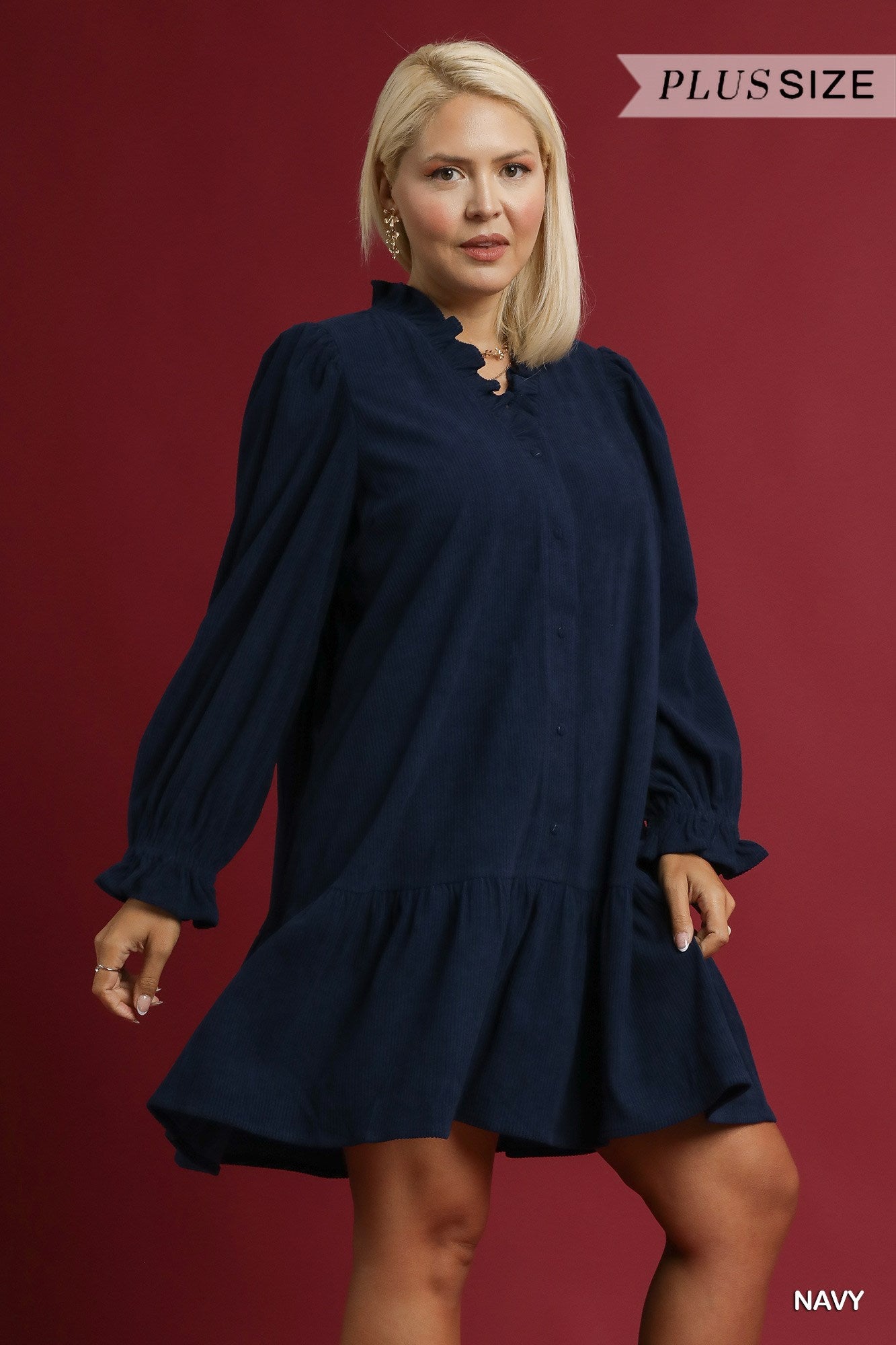 Effortlessly classic and flattering, this navy babydoll dress features soft corduroy texture, button-front detailing, and feminine ruffle accents at the neckline and cuffs. The tiered hem and relaxed fit make it the perfect throw-on-and-go style for any occasion. Designed with comfort in mind — ideal for day-to-night wear.