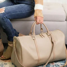 Travel light and look luxe with the Charlotte Duffel Bag in Beige. Crafted from soft vegan leather with gold-tone hardware, this neutral beauty is the perfect companion for weekend getaways, gym trips, or overnight stays. Its spacious interior and organized pockets make it as practical as it is stylish.