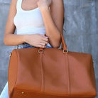 Travel light and look luxe with the Charlotte Duffel Bag in Camel. Crafted from soft vegan leather with gold-tone hardware, this neutral beauty is the perfect companion for weekend getaways, gym trips, or overnight stays. Its spacious interior and organized pockets make it as practical as it is stylish.