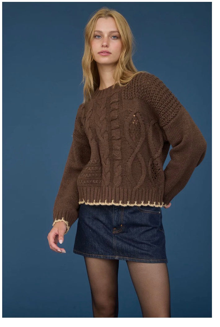 Cozy meets chic in this cable knit sweater. Featuring a rich chocolate brown hue, detailed cable stitching, and a soft cream contrast along the hem and cuffs, it’s the perfect fall layer. The slightly cropped fit pairs effortlessly with high-waisted jeans or skirts for an easy, timeless look.