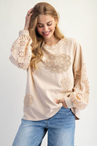 Cozy meets chic in this ecru eyelet lace washed terry pullover. Designed with feminine eyelet lace balloon sleeves and delicate crochet appliqué details, this soft pullover blends casual comfort with elevated style. The neutral ecru shade makes it easy to pair with denim, skirts, or trousers for an effortless everyday look.