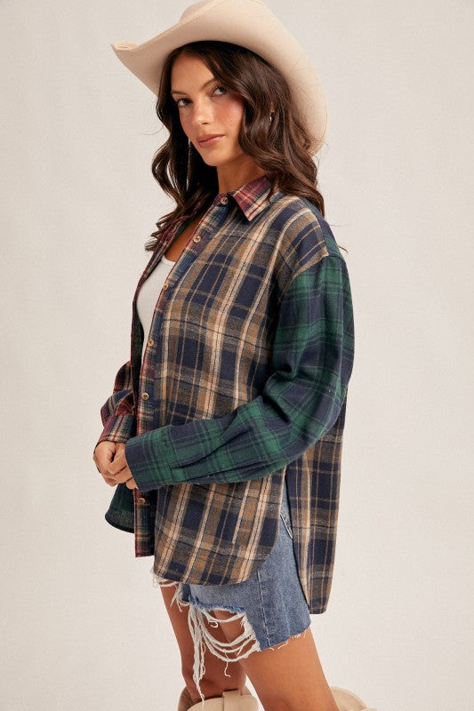 Add a touch of rustic charm to your wardrobe with this Mixed Plaid Button Down. Featuring contrasting plaid panels in warm, earthy tones, this soft and relaxed shirt is a fresh take on a classic fall favorite. Perfect for layering over a tank, tying around your waist, or wearing buttoned up with jeans.