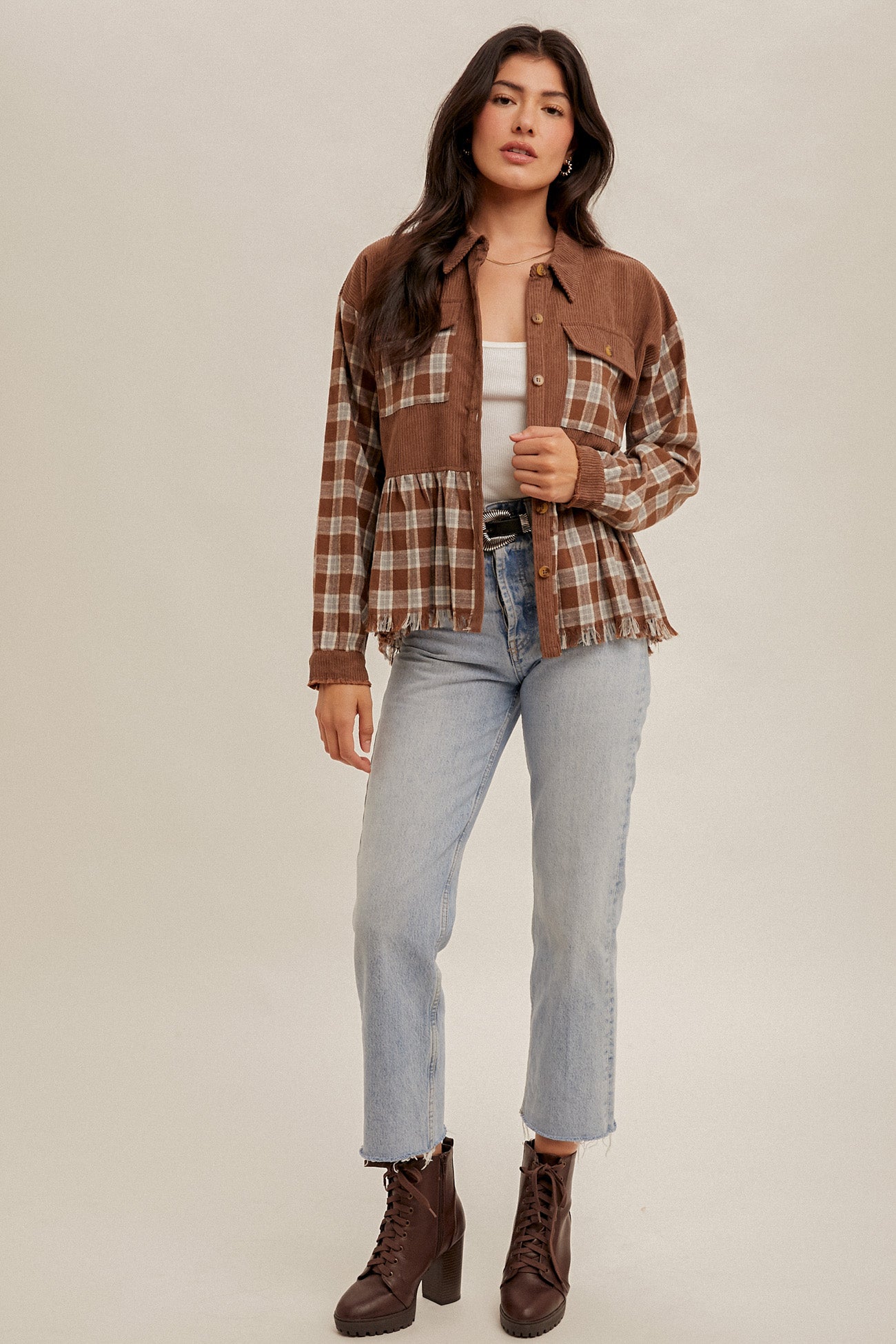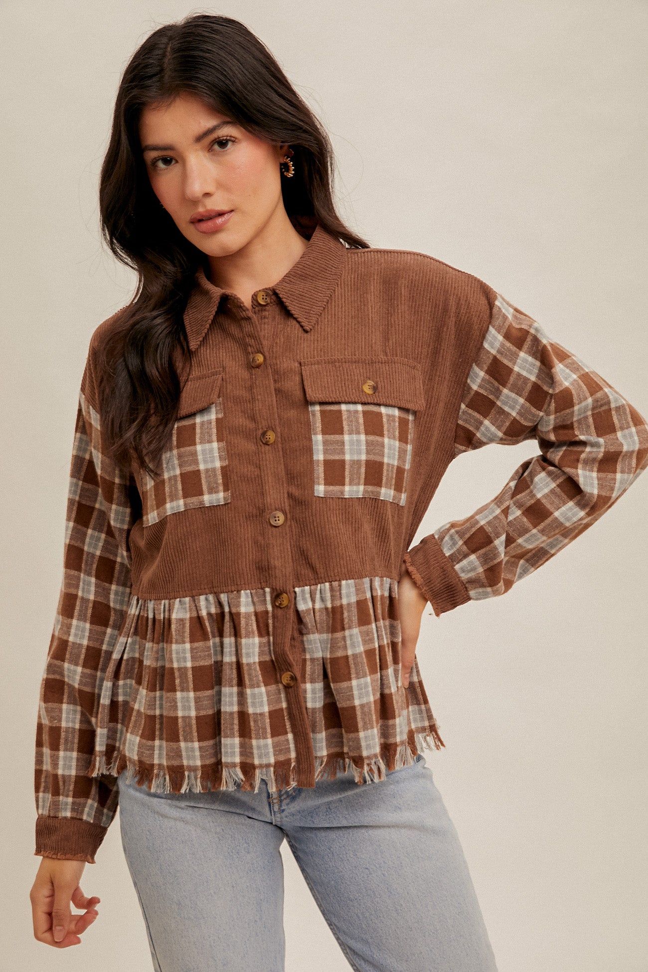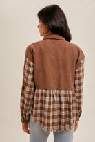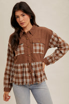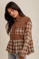 Add a cozy twist to your everyday look with this Plaid Button Down Corduroy Shirt. Designed with a mix of soft plaid fabric and warm corduroy, this casual yet stylish top is perfect for layering all season long. Featuring button-front closure, chest pockets, and a relaxed fit, it pairs effortlessly with jeans or leggings for a laid-back vibe.