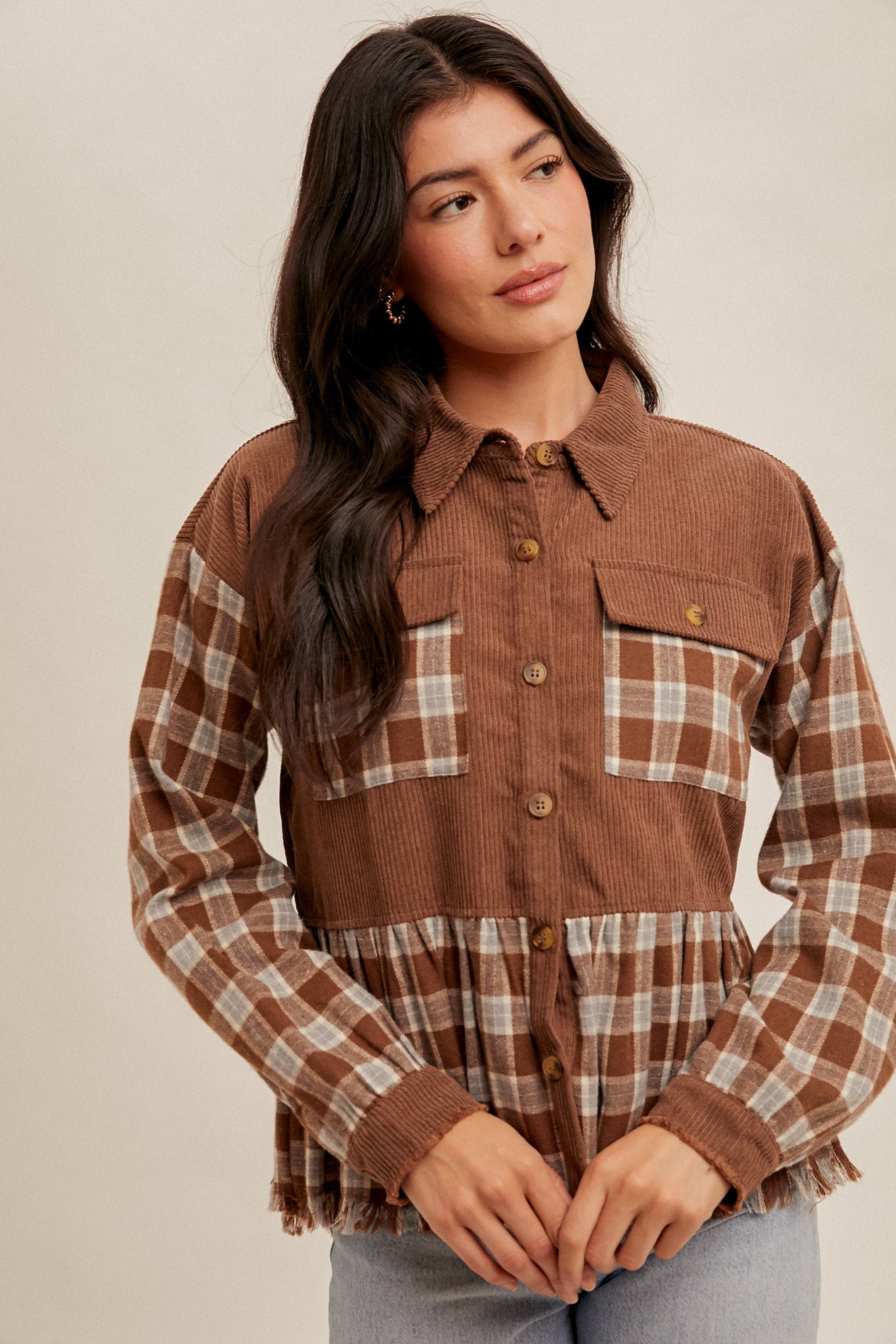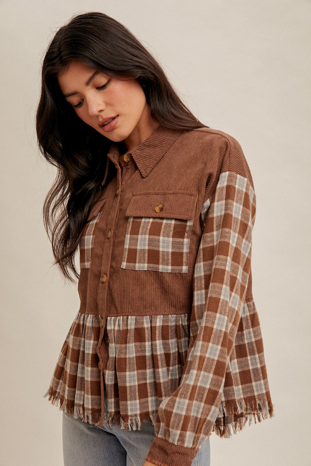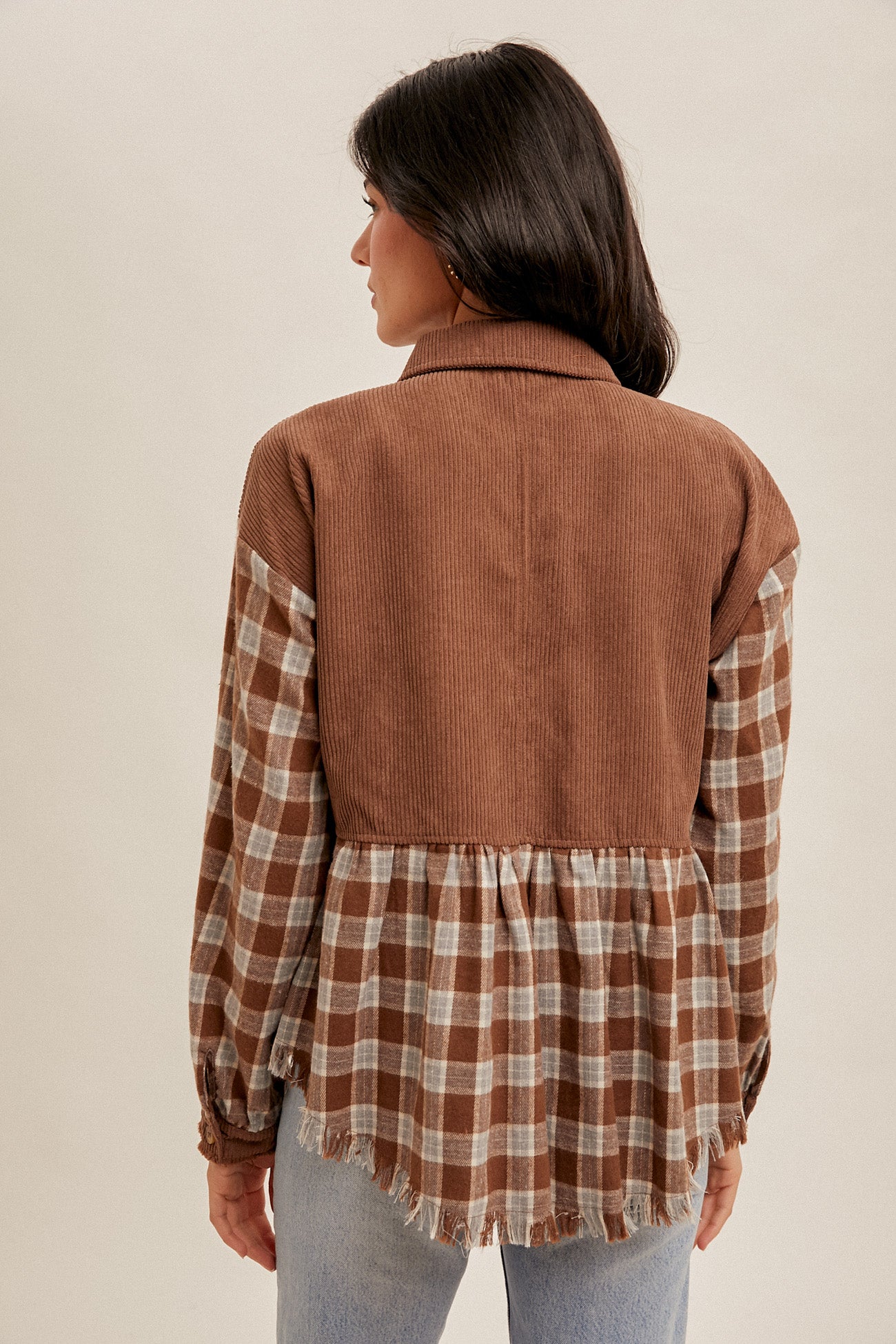 Corduroy yoke and plaid body/sleeves