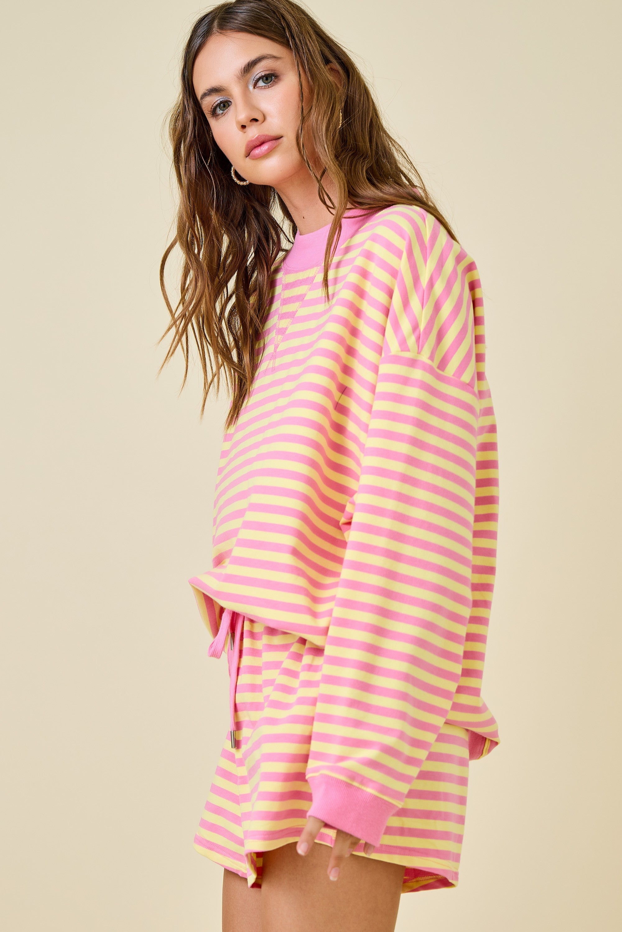 The ultimate cozy-cute lounge layer. This striped terry sweatshirt features a relaxed fit with a modern mock neckline and soft ribbed trim. The pink and yellow stripes give it a fun, fresh pop while the lightweight terry fabric keeps it comfortable enough for all-day wear.