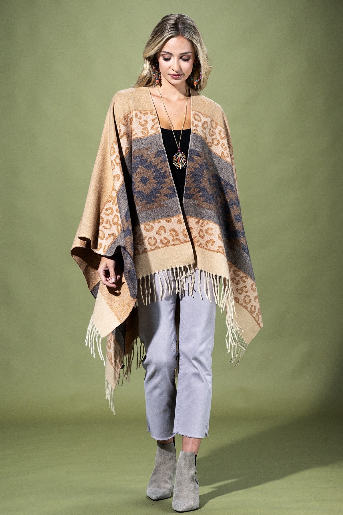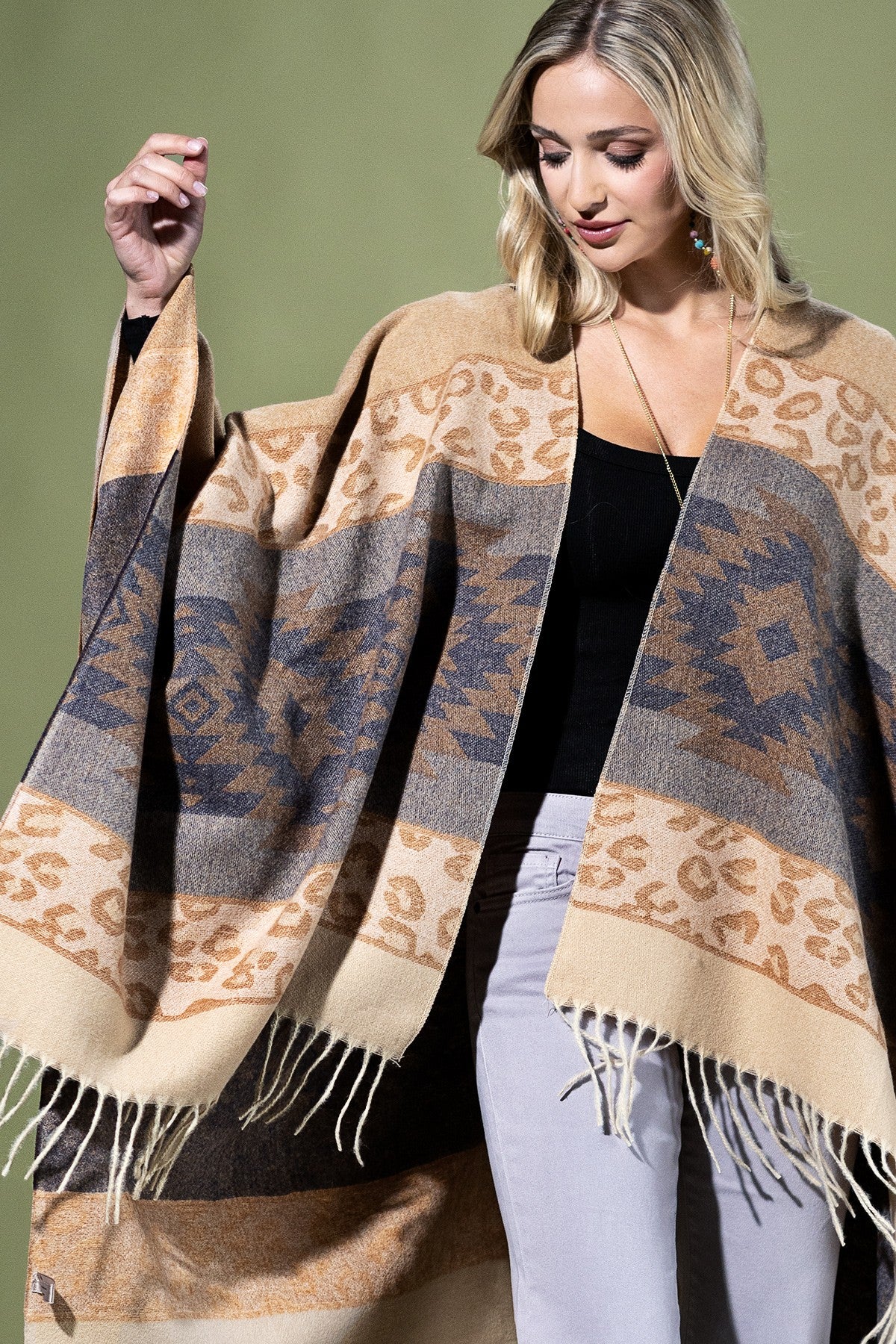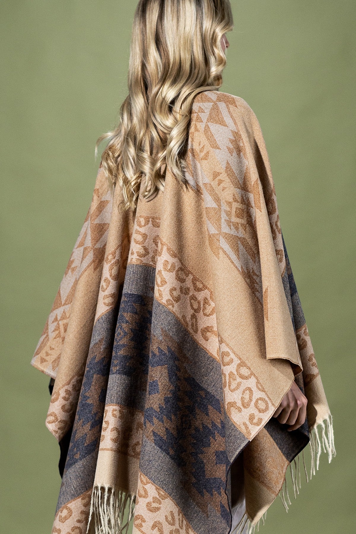 Beautiful aztec cozy ruana with fringe along the bottom edge *100% Polyester *APPROX.L 56" W 33.5" Fringe 1.75" 13.86oz