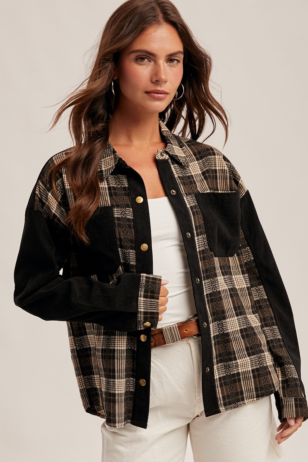 Add an edgy twist to your fall layers with this Black Corduroy Contrast Plaid Shirt. Featuring a mix of bold plaid and soft corduroy, this button-down is perfect for wearing on its own or layered over your favorite basics. With its relaxed fit and classic button-front, it’s a versatile piece that’s both cozy and stylish.