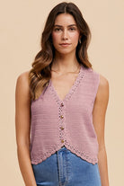 Our Crochet Trim Sweater Vest in rose is a soft and feminine layer that adds charm to any outfit. Featuring delicate crochet lace details at the neckline and hem, this lightweight knit vest is finished with button-front closure for easy styling. The warm rose hue makes it a perfect transition piece from spring to fall.