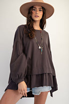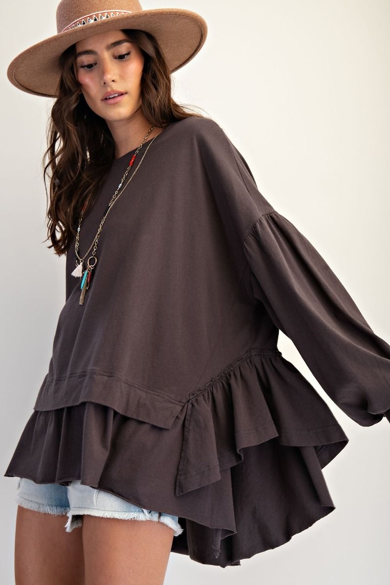 Effortlessly chic and versatile, this Layered Ruffle Bottom Tunic is perfect for everyday wear. Designed with a relaxed fit, tiered hemline, and flowy silhouette, it pairs beautifully with denim shorts, leggings, or skinny jeans. The balloon sleeves and soft fabric give it a comfortable yet elevated look, making it a must-have staple for any season.