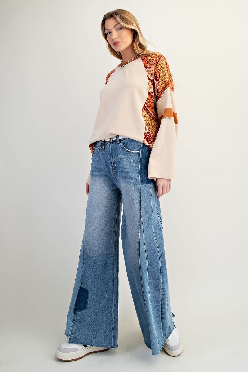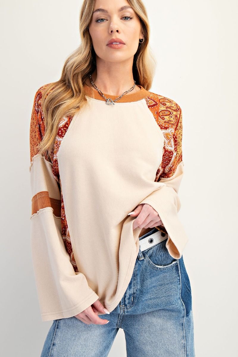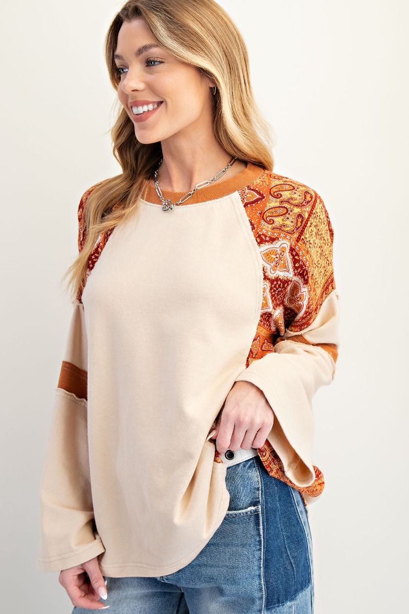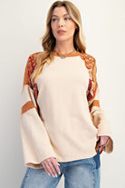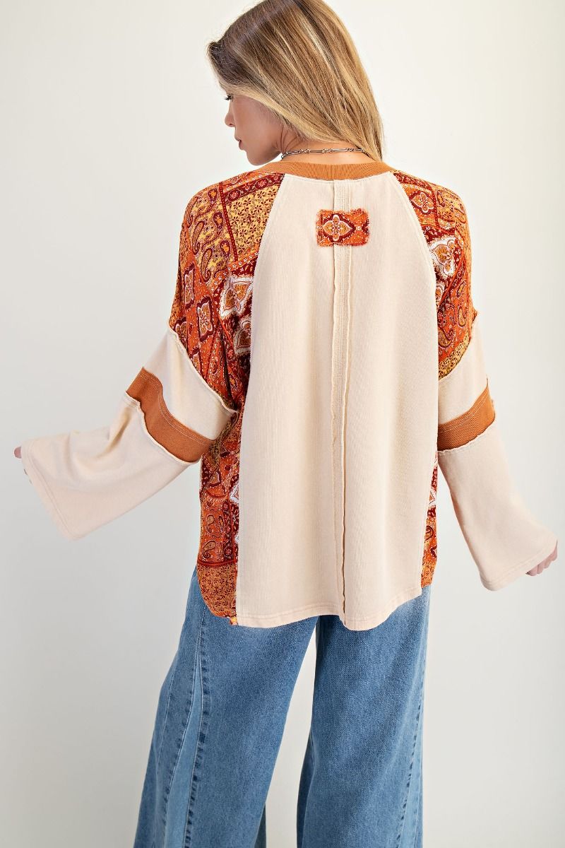 Add a touch of boho charm to your wardrobe with our Print Mix Mineral Washed Top in Natural. This unique long sleeve top features soft mineral-washed fabric, a relaxed fit, and vibrant mixed-print accents on the shoulders and sleeves. The wide sleeves and contrast details give it an effortless, laid-back vibe—perfect for pairing with denim, leggings, or your favorite casual bottoms.