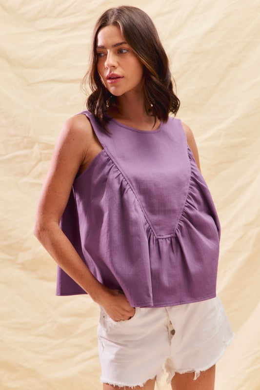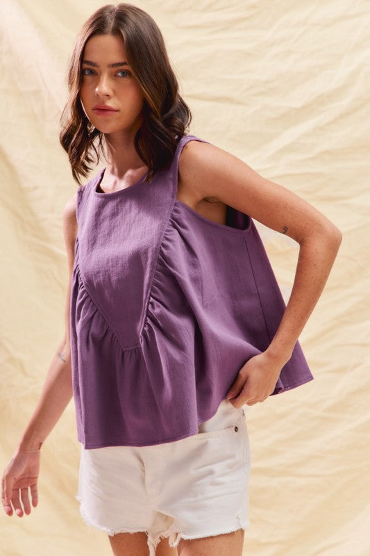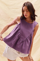 Flowy, fun, and feminine — our Vintage Purple Ruffle Front Sleeveless Top brings effortless style to any summer outfit. Designed with a wide A-line silhouette and soft ruffle details along the front panel, it’s the perfect blend of comfort and charm. Pair it with denim cutoffs or white jeans for an easy daytime look that still turns heads.