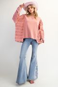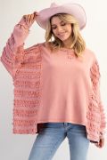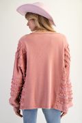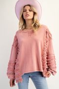 Add a touch of texture to your look with this frayed oversized pullover in a beautiful dusty rose hue. Designed with tiered fringe details, raw-edge seams, and a relaxed silhouette, this top pairs effortlessly with your favorite denim for a cozy yet stylish vibe. The soft fabric and drop shoulder design make it a must-have for layering season.