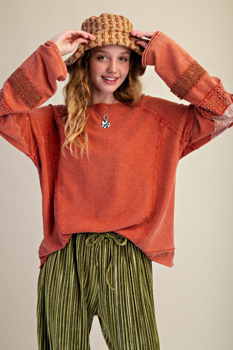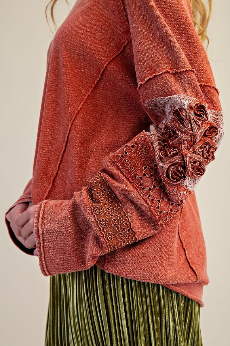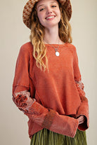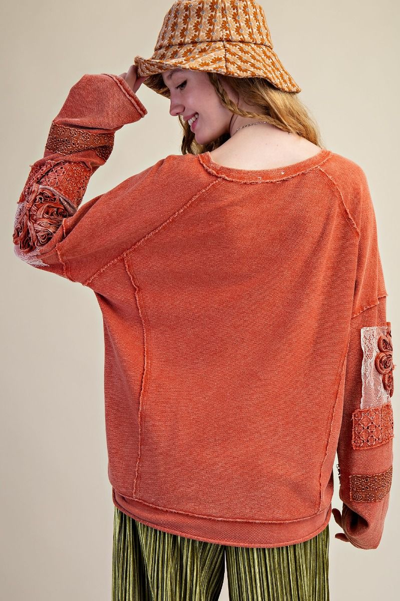 Bring a cozy boho vibe to your wardrobe with the Floral Patchwork Sleeve Top. This mineral-washed pullover features an oversized, relaxed fit with dropped shoulders and exposed seams for that effortless, lived-in look. The standout detail? Beautiful floral embroidery, lace, and eyelet patchwork along the sleeves — giving this everyday top a unique boutique feel.