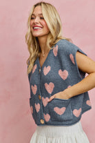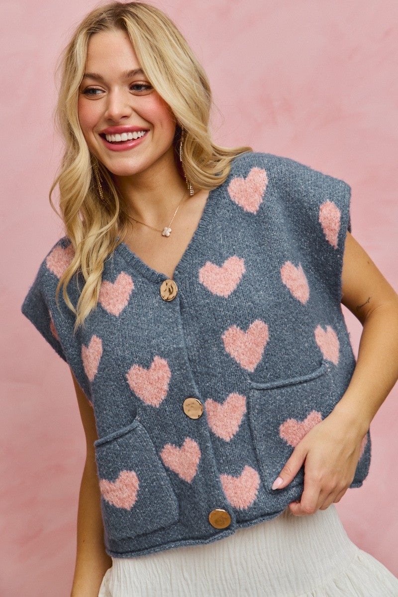 Sweet with a touch of cozy charm. This heart-pattern sweater vest features an all-over pink heart design on a soft gray knit with a relaxed fit and button-front detail. The sleeveless silhouette makes it perfect for layering over tees, blouses, or wearing on its own as a statement top.