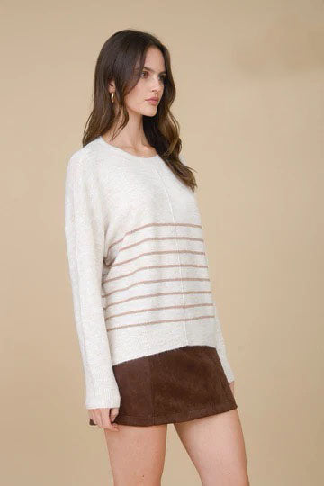 Classic stripes meet cozy comfort in this ivory stripe sweater. Designed with a relaxed fit and soft knit fabric, this pullover is perfect for layering through fall and winter. Neutral tones make it easy to pair with denim, trousers, or skirts for effortless style.