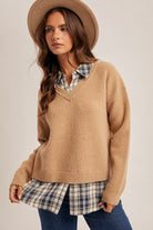 Cozy layers with a polished twist 🤎 This Plaid Contrast V-Neck Sweater Top gives you that perfectly styled, layered look without the bulk. Featuring a soft knit sweater paired with a classic plaid contrast hem and neckline, it’s effortless, flattering, and easy to dress up or down.
