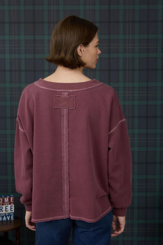 Cozy with an edge. This reverse stitch V-neck long sleeve top is designed with exposed seam details and a relaxed fit that’s perfect for everyday wear. Easy to style with jeans, joggers, or layered under a jacket — it’s your new go-to casual piece.