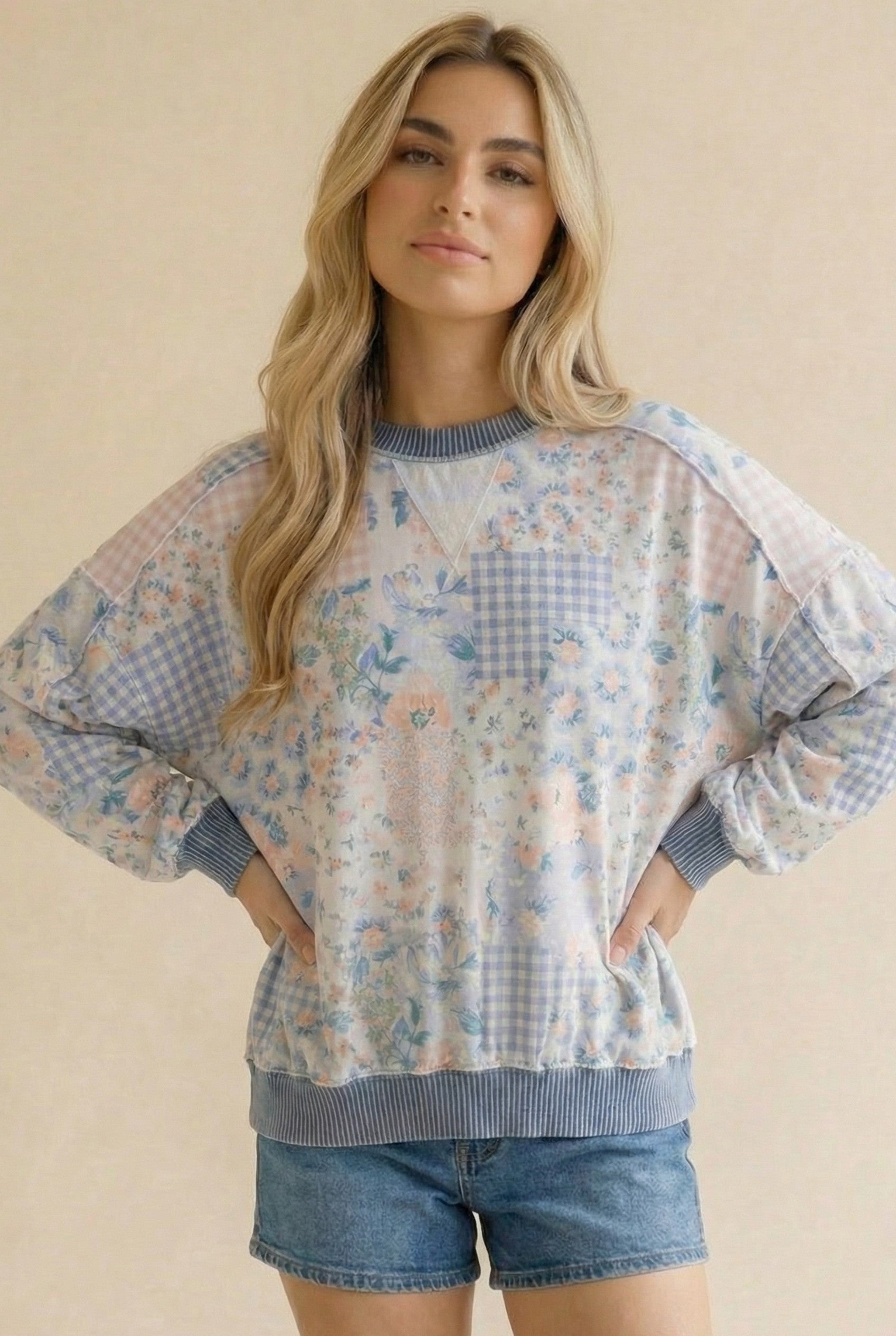 Floral Patchwork Terry Pullover in Light Blue/Denim