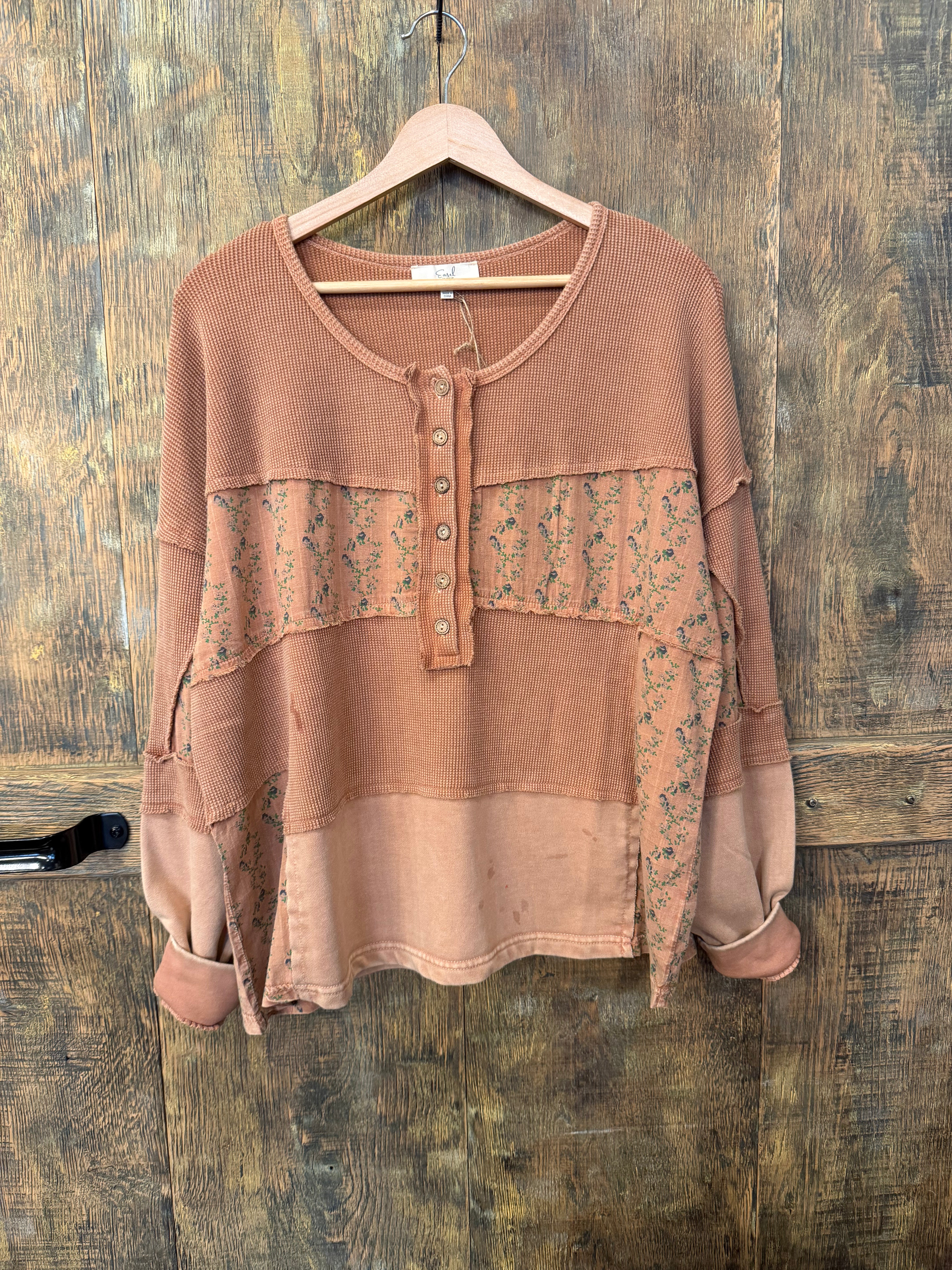 Soft, sweet, and perfectly lived-in — the Floral Patchwork Waffle Henley in Camel is the ultimate cozy-cute top. Designed with a mix of textured waffle knit, floral patchwork panels, and washed cotton contrast, this long sleeve henley brings effortless charm to your everyday style.